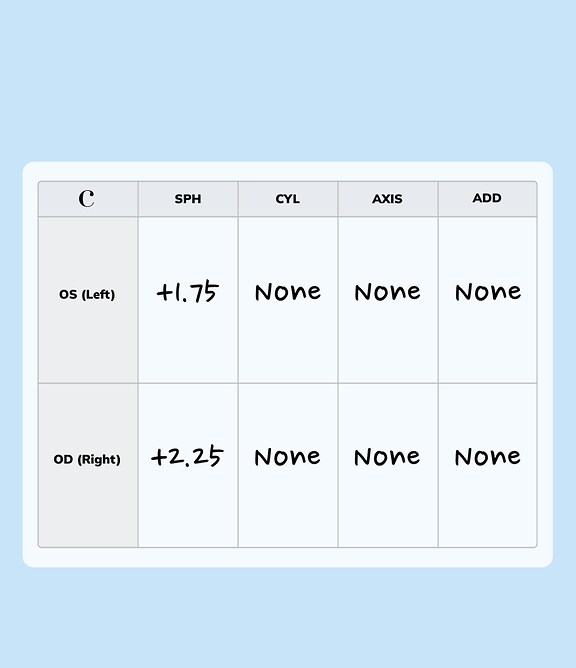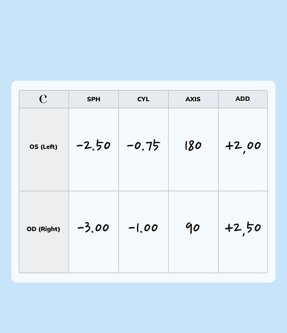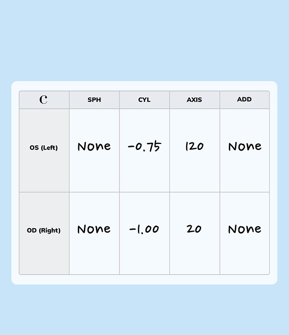 You’ll see numbers under the CYL and AXIS columns of your prescription.